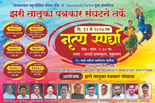 ज्ञानेश्वर आवारी उपसंपादक झरी जामनी दरवर्षी प्रमाणे या ही वर्षी झरी तालुका पत्रकार संघटनेकडून कला गुणांना वाव मिळण्यासाठी नृत्य स्पर्धेचे आयोजन करण्यात आले आहे .ही नृत्य स्पर्धा झरी तालुक्यातील मुकुटबन...