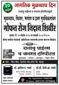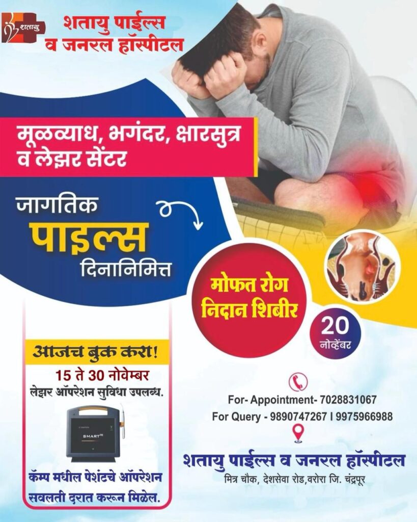वरोरा (चंद्रपूर) : जागतिक मुळव्याध दिनानिमित्त शतायु पाईल्स व जनरल हॉस्पिटल तर्फे मुळव्याध, फिशर, भगंदर तसेच इतर गुदविकारांसाठी मोफत रोगनिदान शिबिराचे आयोजन करण्यात आले आहे. हे शिबीर गुरुवार, दि. २० नोव्हेंबर २०२५ रोजी सकाळी १०.३० ते दुपारी ४.०० या वेळेत भरविण्यात येणार आहे.