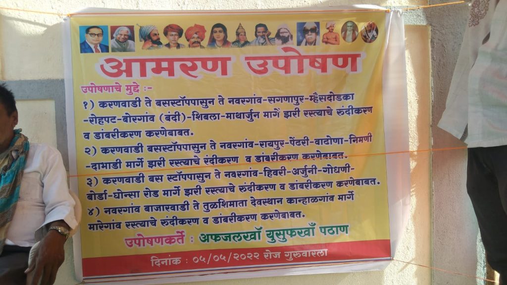 अफजल पठाण यांनी गेल्या 8 एप्रिल रोजी या रस्त्याच्या मागणीसाठी महामहिम राज्यपाल,मुख्यमंत्री, बांधकाम मंत्री,आमदार, सार्वजनिक बांधकाम विभागासह आदींना निवेदन पाठवण्यात आले होते.तसेच रस्त्याचे काम चालू न केल्यास 5 मे पासून आपण आमरण उपोषण करू असा इशाराही निवेदनाद्वारे अफजल पठाण यांनी दिला होता.मात्र प्रशासनाने निवेदनाची कुठलीच दखल न घेतल्याने 5 मे पासुन येथील तहसील कार्यालय समोर आमरण उपोषणास बसले आहे.