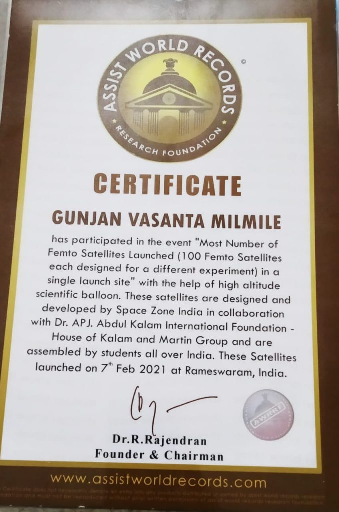 (प्रत्येकी 100 फेमटो उपग्रह वेगळ्या प्रयोगासाठी डिझाइन केलेले)” डॉ. एपीजे अब्दुल कलाम इंटरनॅशनल फाउंडेशन – हाऊस ऑफ कलाम आणि मार्टिन ग्रुप हे संपूर्ण भारतातील विद्यार्थी एकत्र करतात. या कार्यक्रमात गुंजन सुद्धा सहभागी झाल होती. हे उपग्रह 7 फेब्रुवारी 2021 रोजी रामेश्वरम, भारत येथे प्रक्षेपित केले गेले.वर्ल्ड बुक ऑफ रेकॉर्ड सह ,असिस्ट वर्ल्ड रेकॉर्ड रिसर्च फाउंडेशन, अशिया बुक ऑफ रेकॉर्ड, इंडिया बुक ऑफ रेकॉर्ड, स्पेस ऑन ऑफ इंडिया यांच्याकडून गुंजन ला गौरविण्यात आलेले आहेत.