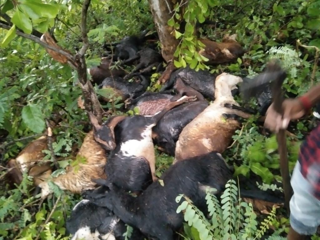 दुपारी आभाळ भरून आल्याने शेळी चारणारे गुराखी बंडू कुमरे व हनुमंत चुक्कबाेटलावार हे दोघे बकऱ्यांना झाडाखाली घेऊन जाऊन बाजूला थांबले अचानक झाडावर वीज पडली सुदैवाने कोणतीही मणुष्य हानी झाली नाही.बंडू कुमरे याचे कडे चराई करिता ५७ बकऱ्या असल्याची माहिती प्राप्त झाली आहे .तर हनुमंत चुकाबूतलावार यांचे कडे १५ शेळी व ४५ मेंढी एकूण ६० नग चराई करिता होते.सदर शेळ्या उस्मान खान पठाण, हनुमंत चुक्कबाेटलावार, गजानन गोंड्रावार तथा मांडवी येथील शेतकऱ्यांच्या असल्याची माहिती असून त्यात शेळी व मेंढी पालकांचे मोठे आर्थिक नुकसान झाले आहे .