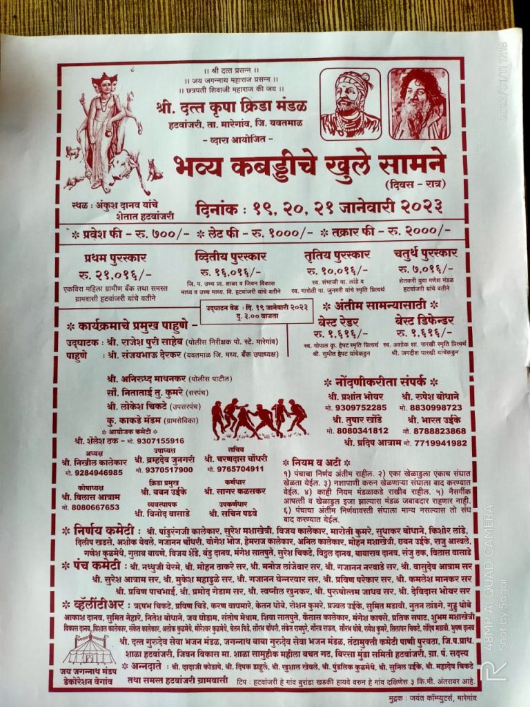 हटवांजरी येथे कबड्डीच्या खुल्या सामन्याचे आयोजन दिनांक 19 ते 21 जानेवारी 2023 पर्यंत करण्यात आले असून या सामन्यामध्ये बक्षिसाचे मोठ्या प्रमाणात लय लुट करण्यात आलेली आहे.