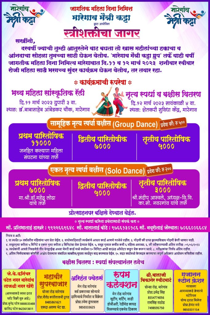 सुरेश पाचभाई मारेगाव- “मारेगाव मैत्री कट्टा ग्रुप” तर्फे दरवर्षी प्रमाणे याही वर्षी जागतीक महिला दिना निमित्य मारेगावात दिनांक ११ व १२ मार्च २०२३ ला शनीवार व रवीवार रोजी महिलांसाठी भरगच्च विविध सांस्कृतिक कार्यक्रमाचे आयोजन करण्यात आले आहे.