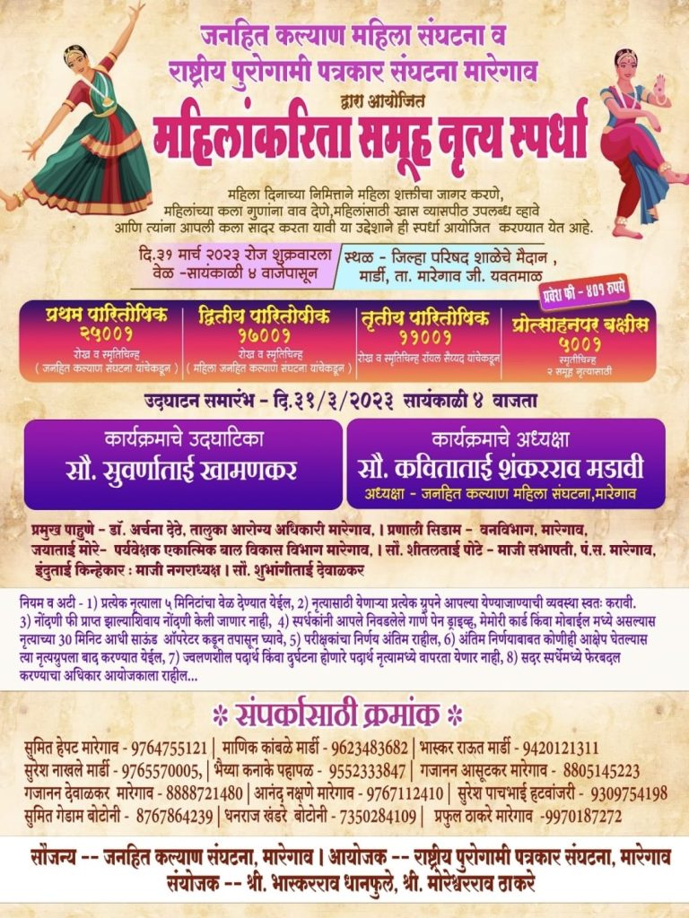 महीलांचे सबलीकरण व सशक्तीकरण ही काळाची गरज असुन महिलातील सूक्ष्म कलागुणांना वाव मिळण्यास योग्य व्यासपीठ उपलब्ध व्हावे या अनुषंगाने एक पाऊल पुढे जात जनहित कल्याण महिला संघटना आणि राष्ट्रीय पुरोगामी पत्रकार संघ मारेगाव यांच्या संयुक्त विद्यमाने “भव्य महिला समूह नृत्य स्पर्धेचे आयोजन” 31 मार्च 2023 रोजी मार्डी येथील जिल्हा परिषद प्राथमिक शाळेच्या प्रांगणात सायंकाळी 4 वाजता करण्यात आले आहे.