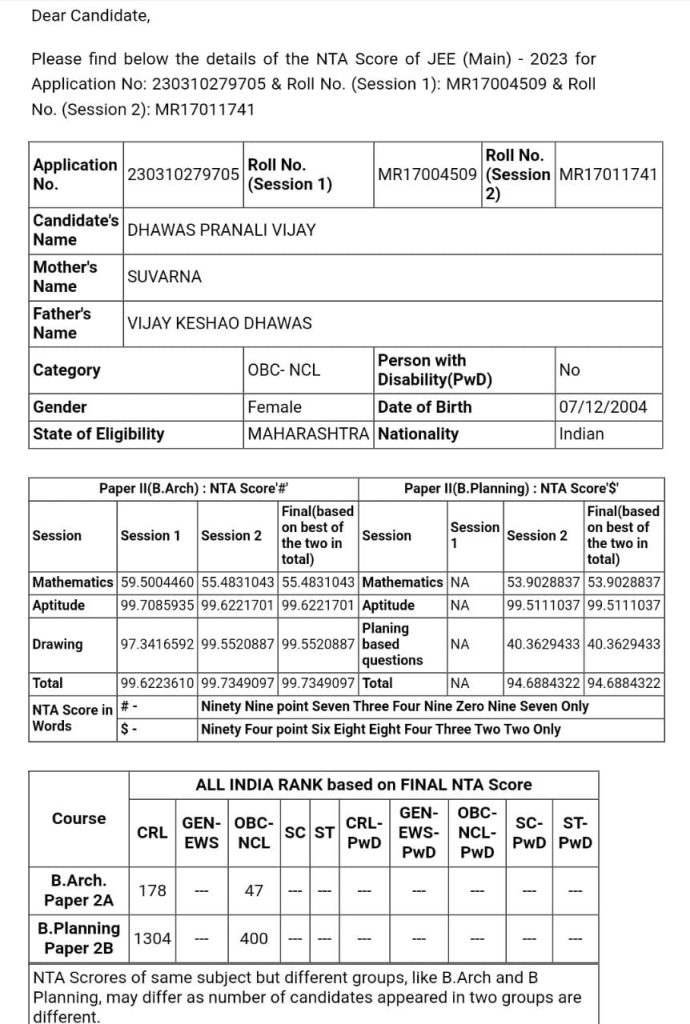 कु.प्रणाली विजय ढवस JEE B.arch परीक्षेत 99.73 % टाईल घेऊन देशातुन 47 वा नंबर.