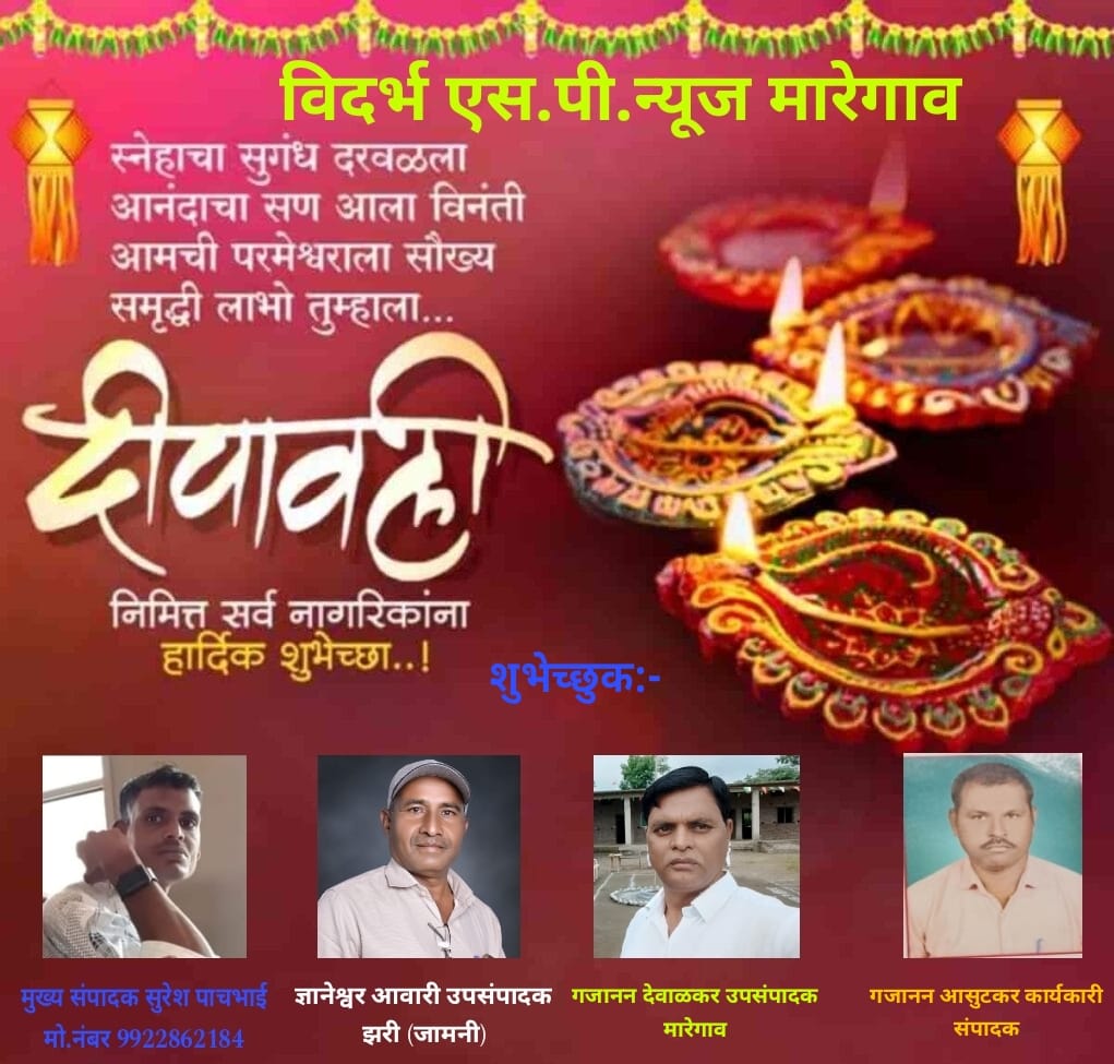 मुख्य संपादक सुरेश पाचभाई,गजानन देवाळकर उप संपादक मारेगाव,ज्ञानेश्वर आवारी उपसंपादक झरी (जामनी), गजानन आसुटकर कार्यकारी संपादक,दशरथ चिकनकर बोटोणी विभाग व सर्व टीम कडून दिवाळीच्या हार्दिक शुभेच्छा…!