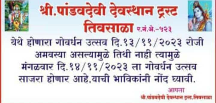 मारेगाव तालुक्यांतील पांडवदेवी (तिवसाळा) हे देवस्थान हे वणी यवतमाळ रोडवरील जळका स्टॉप वरुण दक्षिणेस 1की. मी. अंतरावर आहे.श्रीशेत्र पांडवदेवी देवस्थान ट्रस्ट,तिवसाळा र.नं. ओ- 523 येथे होणारा गोवर्धन उत्सव दरवर्षी प्रमाणे याही वर्षी दिनांक 13 नोव्हेंबर 2023 रोज सोमवारला अमवस्या असल्यामुळे ही तिथी बदलविण्यात आली होती.