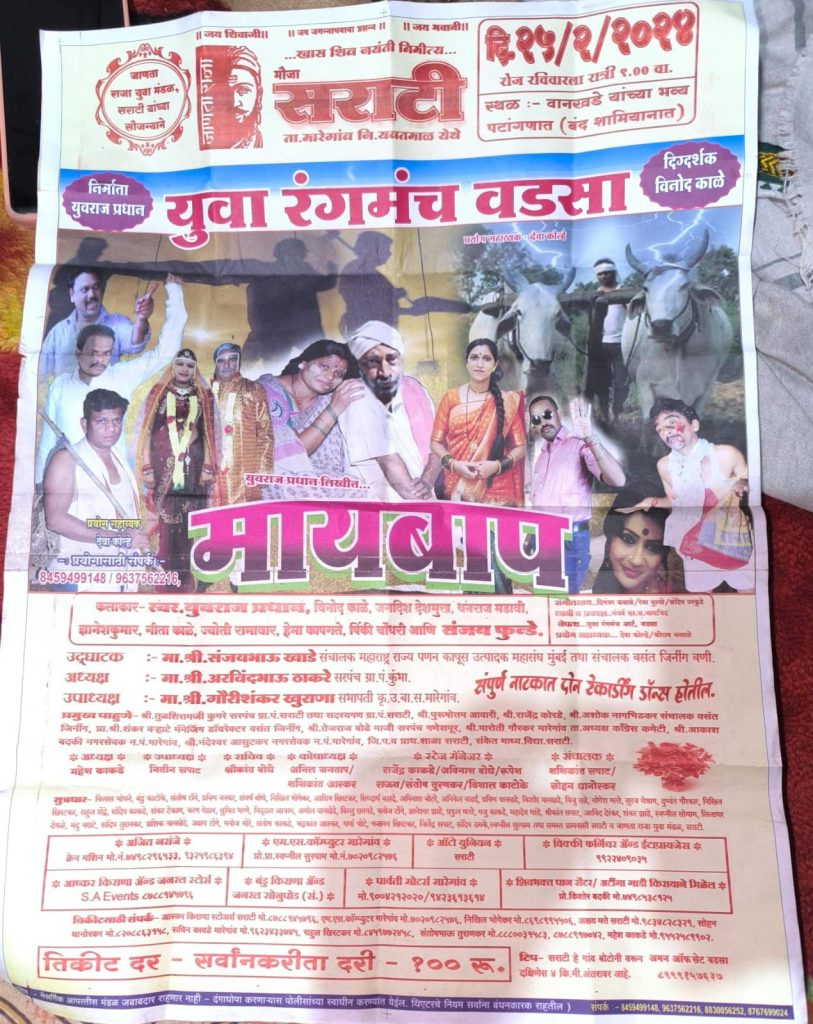 मारेगाव तालुक्यातील सराटी येथे युवा रंगमंच वडसा प्रस्तुत ” मायबाप ” हे नाटक सादर करण्यात येणार आहे.सदर नाटक हे दिनांक 25 फेब्रुवारी 2024 रोज रवीवारला रात्री 9 वाजता वानखेडे यांच्या भव्य पटांगणात सादर करण्यात येणार आहे.