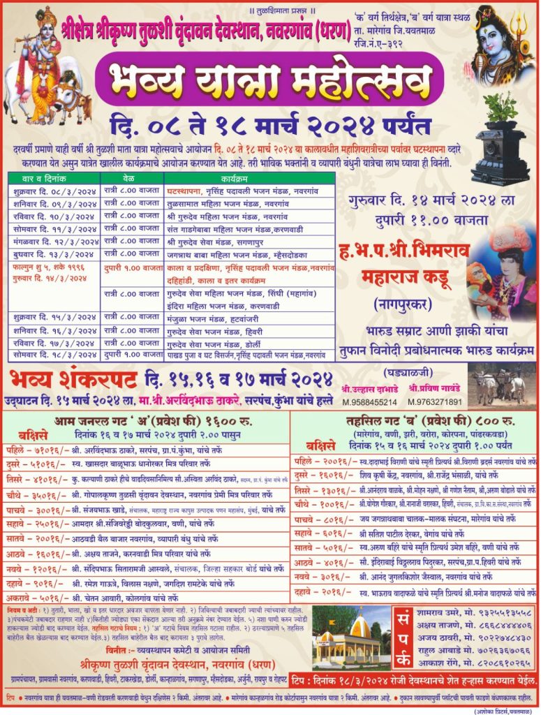 दिनांक १४ मार्च पासुन सुरु होणाऱ्या यात्रेचा परिसरातील भाविककान्हा आनंद घेता येणार आहे.श्री क्षेत्र तुळशी वृंदावन देवस्थान नवरगांव धरण रजिस्टर नंबर ए.३९२ द्वारा दिनांक १४ ते १८ मार्च पर्यंत या भव्य यात्रा उत्सवाचे आयोजन करण्यात आले आहे.