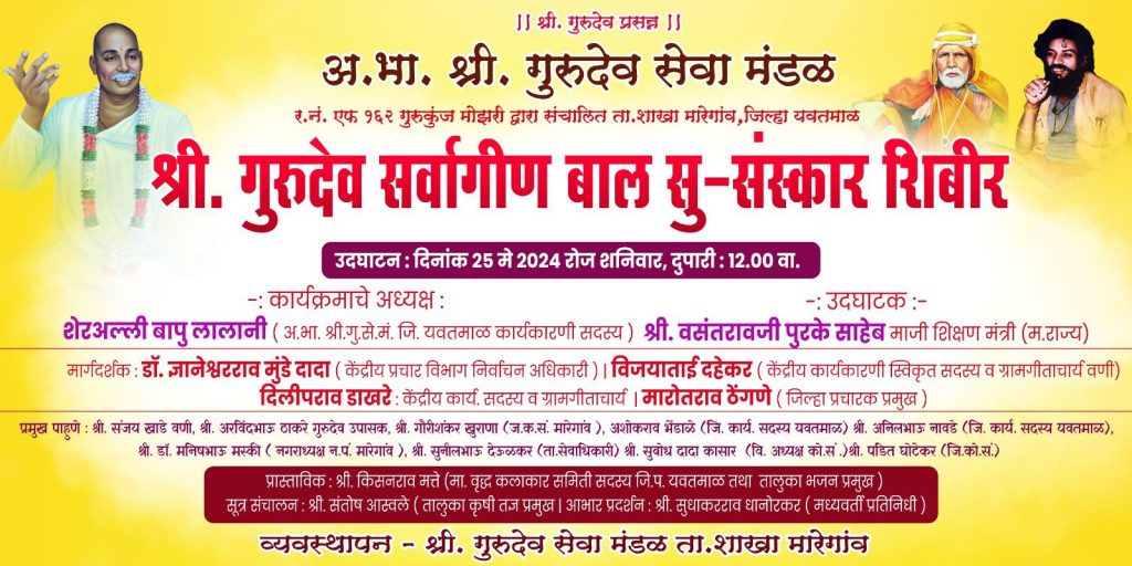 अखिल भारतीय श्री गुरुदेव सेवा मंडळाच्या तत्त्व प्रणालीनुसार ग्रामगीता,धर्म संस्कृती,राष्ट्रीय एकात्मतेस पोषक असा राष्ट्रभक्त तरुण घडावा या दृष्टीने जीवन शिक्षणाचे पाठ आजच्या नवयुवकांना देण्यासाठी दिनांक 25 मे 2024 पासून श्री गुरुदेव सर्वांगीण सुसंस्कार शिबिराचे आयोजन करण्यात आले आहे. मुले म्हणजे देवाघरची फुले, ती पवित्र आहेत, ती पवित्र राहिली पाहिजे.त्यांना गरीबी श्रीमंतीच्या वादळाची झळ,पंथ, पक्षाचा वारा आणि तिचा जळमट लागू देऊ नये. तरच इथे देवाचे राज्य येईल.