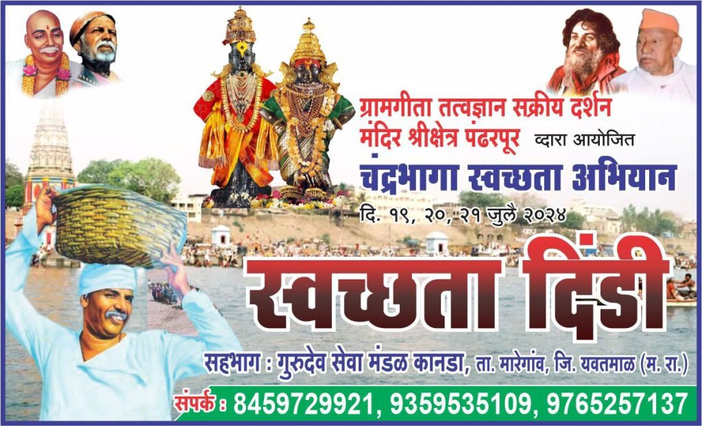 दरवर्षी आषाढी वारीनिमित्ताने पंढरपूर येथे विठ्ठल भक्तांची मांदियाळी असते. महाराष्ट्र तसेच देशाच्या कानाकोपऱ्यातून वारकरी पंढरपूर येथे दर्शनासाठी जातात. मग या पंढरपूरच्या चंद्रभागा नदीमध्ये मोठया प्रमाणात घाणीचे साम्राज्य निर्माण होतात.अशावेळी ही घाण स्वच्छ करण्याचे महत्वाचे कार्य हाती घेणाऱ्या गुरुदेव उपासक सेवकराम मिलमिले यांच्या मार्गदर्शनामध्ये हा उपक्रम चालत असतो.