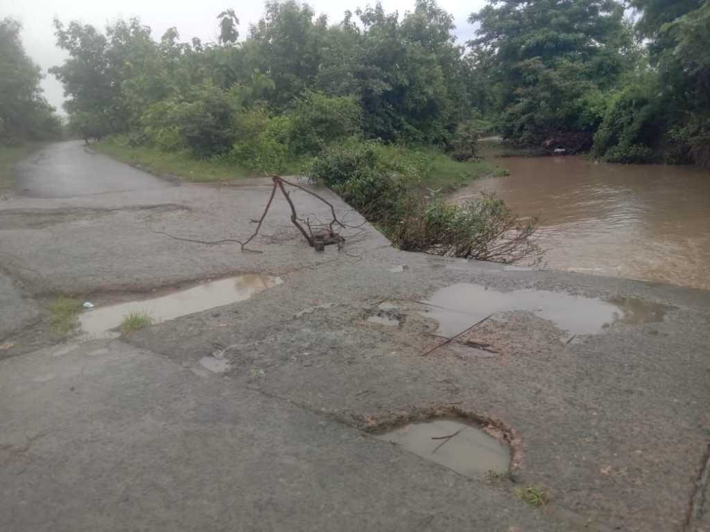 सध्या सतत पाऊस सुरू असून पुराचा जोर वाढला आहे.पुराच्या पाण्यामुळे मधोमध चार फूट लांब रुंदीचे खड्डे पडले असून सिमेंट पाइप उघडे पडले आहेत.पुलावर पाणी वाहत असताना खड्डाचा अंदाज येत नाही.दुचाकी व चारचाकी वाहन खड्डयात पडून अपघात होण्याची दाट शक्यता आहे.