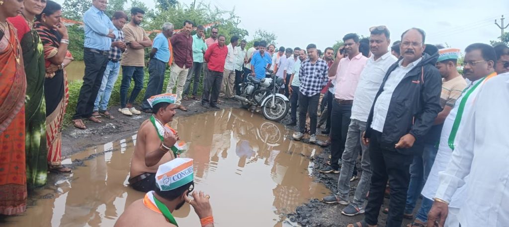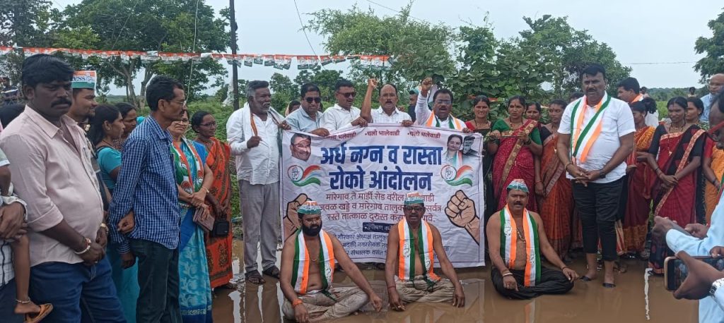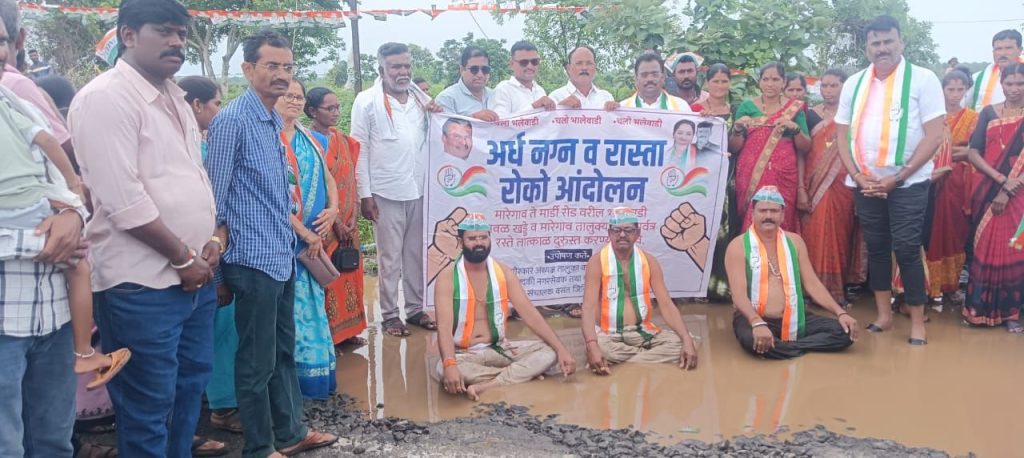 मारेगाव ते मार्डी रस्त्यादरम्यान असलेले खड्डे त्वरित बुजविण्यात यावे तसेच थांबवण्यात आलेले रस्त्याचे काम त्वरित करण्यात यावे या मागणीसाठी तालुका काँग्रेस तर्फे आज दिनांक 28 जुलै 2025 रोज सोमवारला अर्ध नग्न आंदोलन करण्यात आले.
