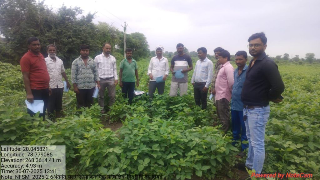 या प्रात्यक्षिकास अक्षय सोनुले उप कृषी अधिकारी,सचिन आत्राम सहाय्यक कृषी अधिकारी ,तुषार मेश्राम सहाय्यक कृषी अधिकारी यांनी भेट दिली.यावेळी त्यांनी सोयाबीन पिकावर येणाऱ्या विविध रोग व किडींच्या एकात्मिक कीड व रोग व्यवस्थापनाबाबत (IPM – Integrated Pest Management) सविस्तर मार्गदर्शन केले.