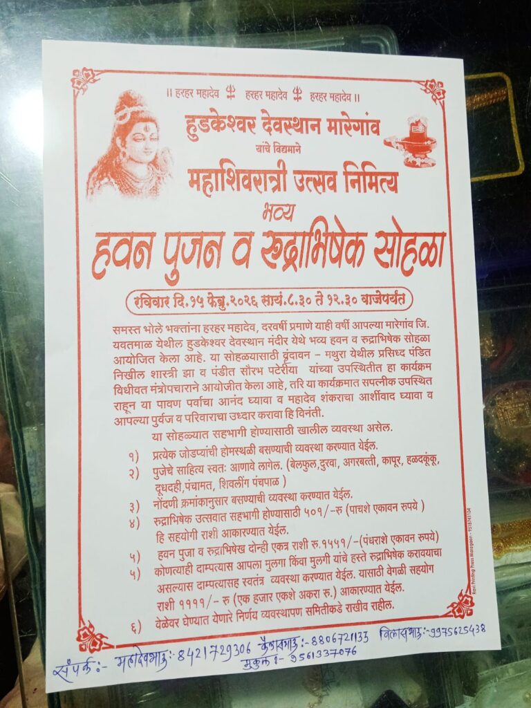 मारेगाव येथील प्रसिद्ध हुडकेश्वर देवस्थान येथे महाशिवरात्री उत्सवाचे औचित्य साधून रविवार, दिनांक १५ फेब्रुवारी २०२६ रोजी भव्य हवन पूजन व रुद्राभिषेक सोहळ्याचे आयोजन करण्यात आले आहे. दरवर्षीप्रमाणे यंदाही हा सोहळा अत्यंत उत्साहात आणि शास्त्रोक्त पद्धतीने पार पडणार असून, यासाठी वृंदावन (मथुरा) येथील सुप्रसिद्ध विद्वान उपस्थित राहणार आहेत.
