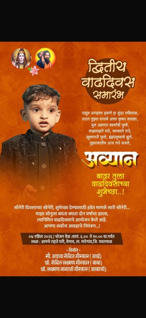 मारेगाव तालुक्यातील वेगांव येथील गौरकार कुटुंबातील चिमुकला कुमार अव्यान रोहित गौरकार याचा दुसरा वाढदिवस मंगळवार, दि. ७ एप्रिल २०२६ रोजी आनंदात साजरा करण्यात येत आहे.