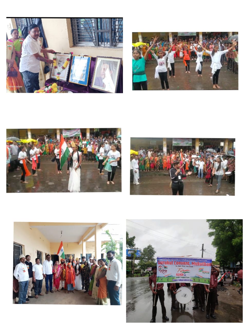 शाळेचे मुख्याध्यापक गजभिये सर यांनी स्वातंत्र्य सोहळ्याचे प्रस्ताविकपर यावेळी भाषण केले.शाळेच्या विद्यार्थ्यांनी यावेळी भाषणे सादर केली तसेच देशभक्तीपर गीत गायन केले.वर्ग 8 विचा विद्यार्थी अंशुल गोडे याने अद्भुत असा पोवाडा यावेळी सादर करून उपस्थितांना मंत्रमुग्ध केले.शाळेतील कार्यक्रम झाल्यानंतर शाळेची स्वातंत्र्याची रॅली मुकुटबन कडे वळली.यामध्ये इयत्ता 8 ,9 व 10 वी च्या विद्यार्थ्यांचा समावेश होता. योग्य शिस्तबद्ध पद्धतीने भरपावसात यावेळी मुकुटबन नगरीत शाळेच्या वतीने रॅली काढण्यात आली.