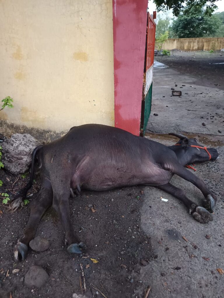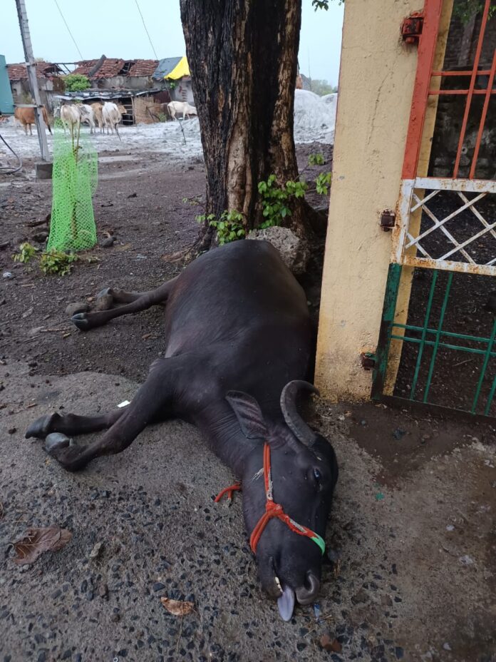 अशातच काल दि.27 मे ला दुपारी 4:30 वाजताच्या दरम्यान आकाशात ढग दाटून आले.आणि अचानक वादळ, वारा आणि विजांच्या कडकडाटाला सुरुवात झाली.पाऊसही लागला.त्यामुळे शेतातील म्हैस हिने घराचा रस्ता धरला.आणि गावातील जि.प.शाळे जवळ असलेल्या कर्माचा झाडाखाली उभी राहिली.