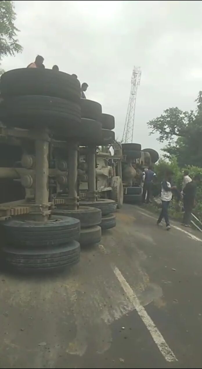 वणी तालुक्यातील नवरगाव जवळील सैदाबाद फाट्या जवळ एक सिमेंटचा ट्रक क्रमांक RJ 57 GA 0195 हा भर रस्त्यात पलटी झाला यामुळे मुकुटबन कडून वणीकडे व वणी कडून कायर कडे जाणारी सर्व वाहतुक कोलमडली आहे.