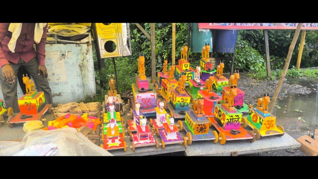 दिनांक 22 ऑगस्ट 2025 रोज शुक्रवारला होणाऱ्या बैलपोळ्याच्या निमित्ताने बाजारपेठेत वेसन, पैंजण, झूल, बेगड, मोरके, कवडी, घंटा, आंबी हळद, पिंपळपान, सडे, चौरंग आदी साजसामानांची दुकाने मोठ्या प्रमाणावर उभी राहिली. चौफेर रस्त्यांवर रंगीबेरंगी साहित्य पाहण्यासाठी व खरेदीसाठी शेतकऱ्यांसह नागरिकांची प्रचंड गर्दी उसळली.