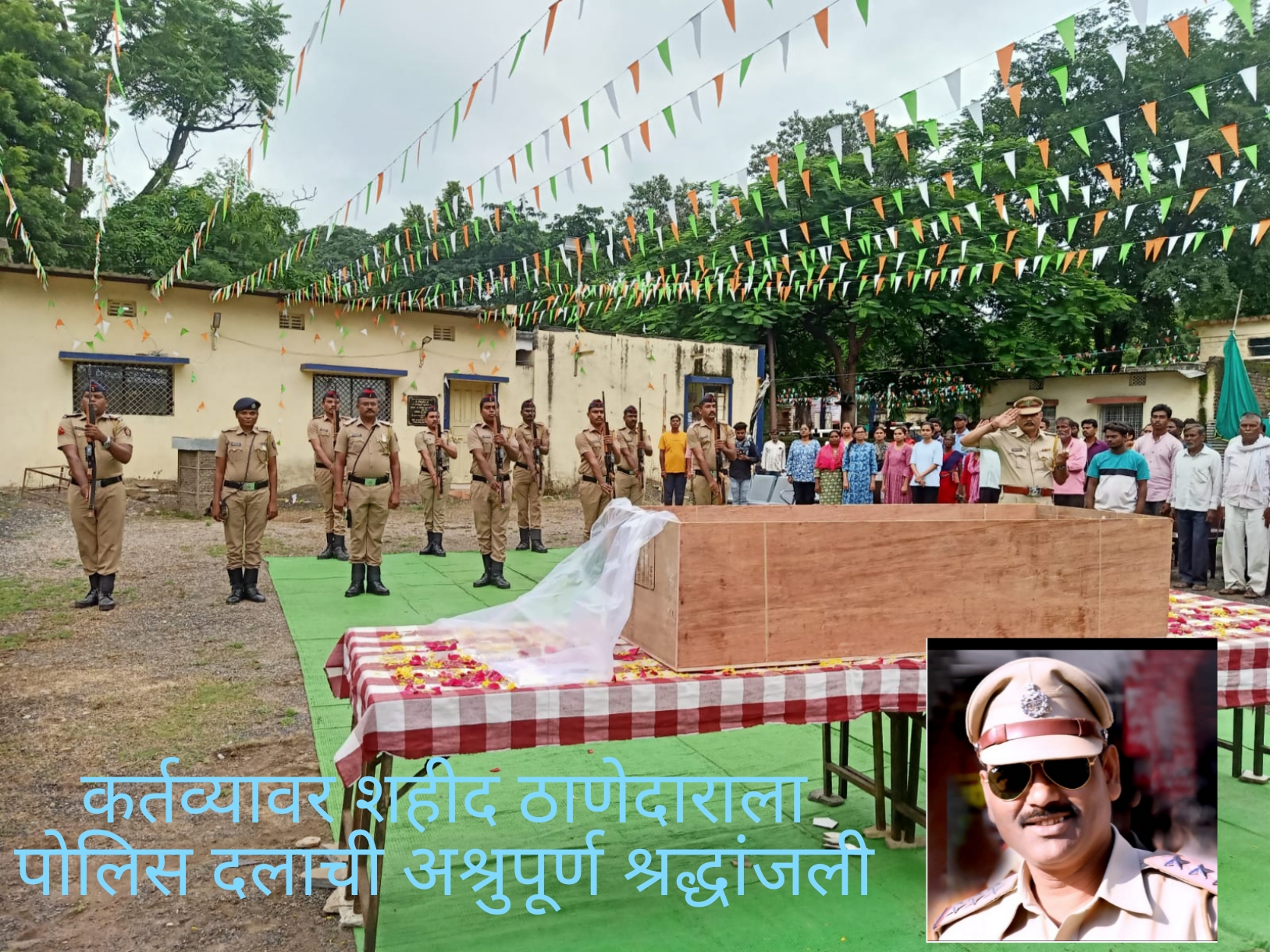 शनिवार, दि. 23 फेब्रुवारी 2025 रोजी संध्याकाळी 6.30 वाजता वणी येथील SDPO कार्यालयाच्या प्रांगणात आयोजित श्रद्धांजली सभेत वरिष्ठ अधिकारी, कनिष्ठ कर्मचारी, सहकारी व नागरिक मोठ्या संख्येने उपस्थित राहिले. शिस्तबद्ध तुकडीने दिलेली अखेरची सलामी आणि बिगुलाचे स्वर दुमदुमताच वातावरण भावनिक झाले.
